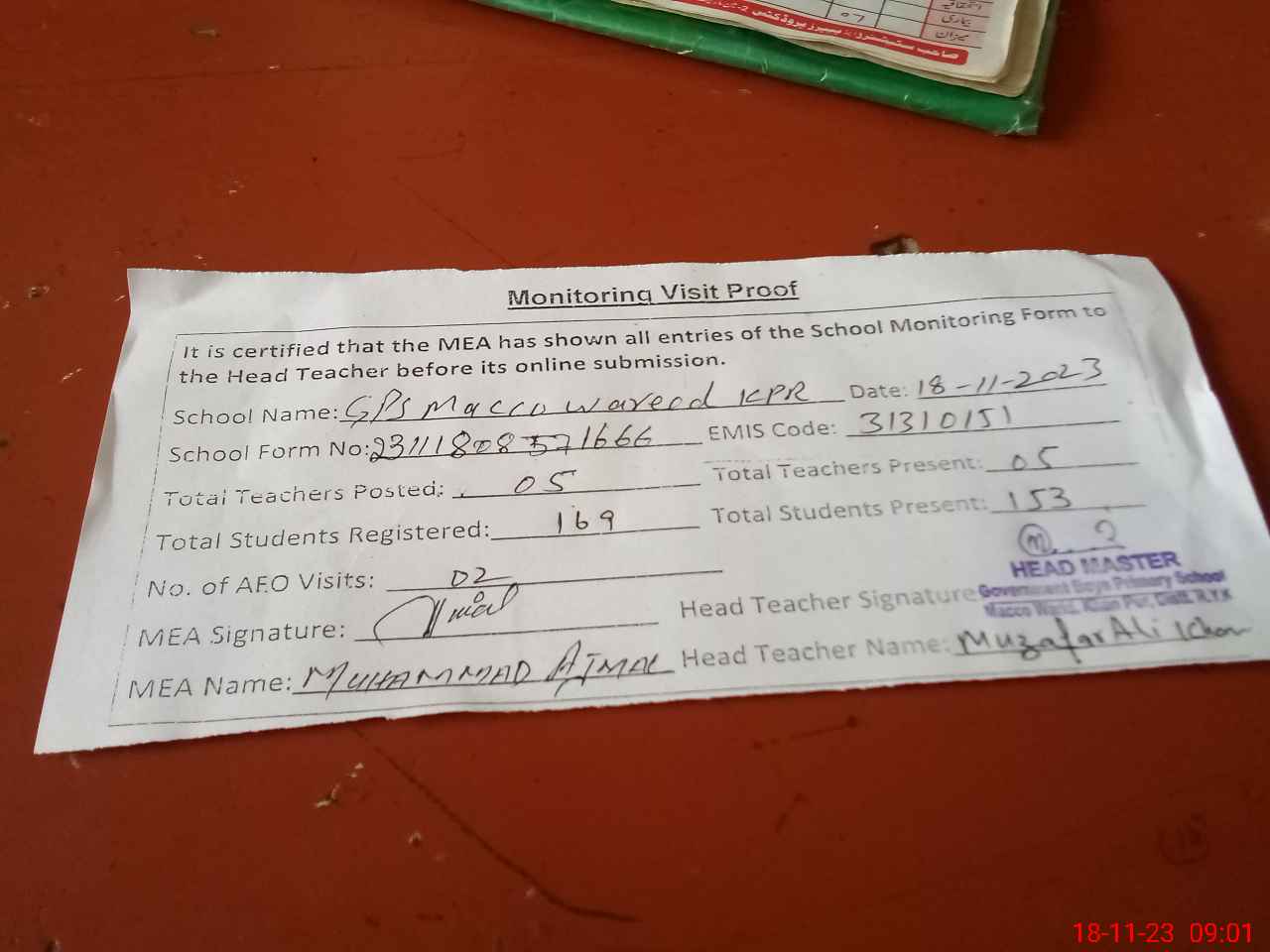 | Attendance Register | Head Teacher | MEA with School | Visit Proof |
