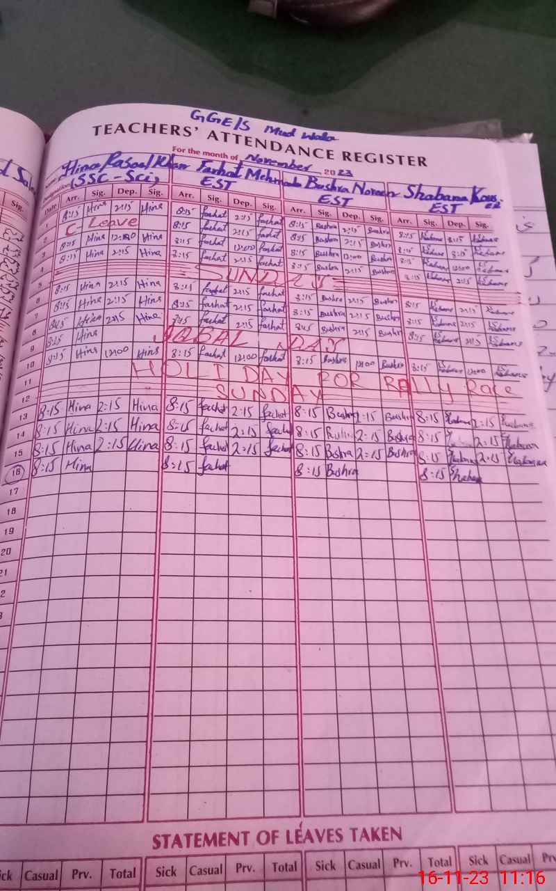 | No. of Students Present - Female | 11 | 0 | 26 | 26 | 21 | 23 | 31 | 22 | 20 | 17 | 19 | 216 | ||||