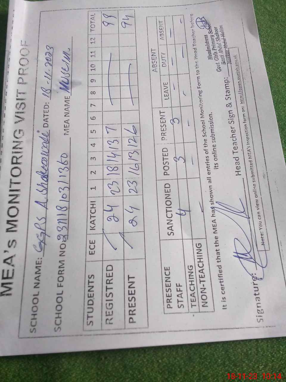 | Attendance Register | Head Teacher | MEA with School | Visit Proof |
