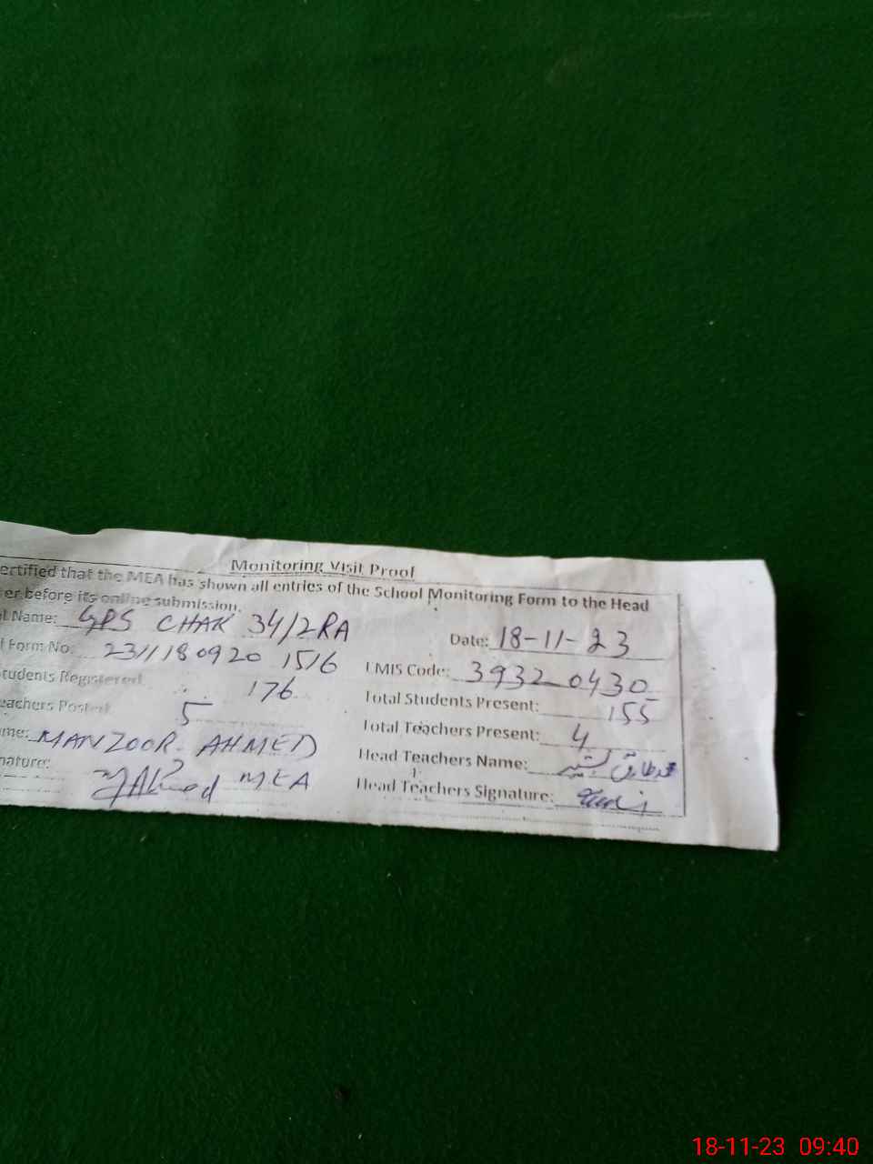 | Attendance Register | Head Teacher | MEA with School | Visit Proof |