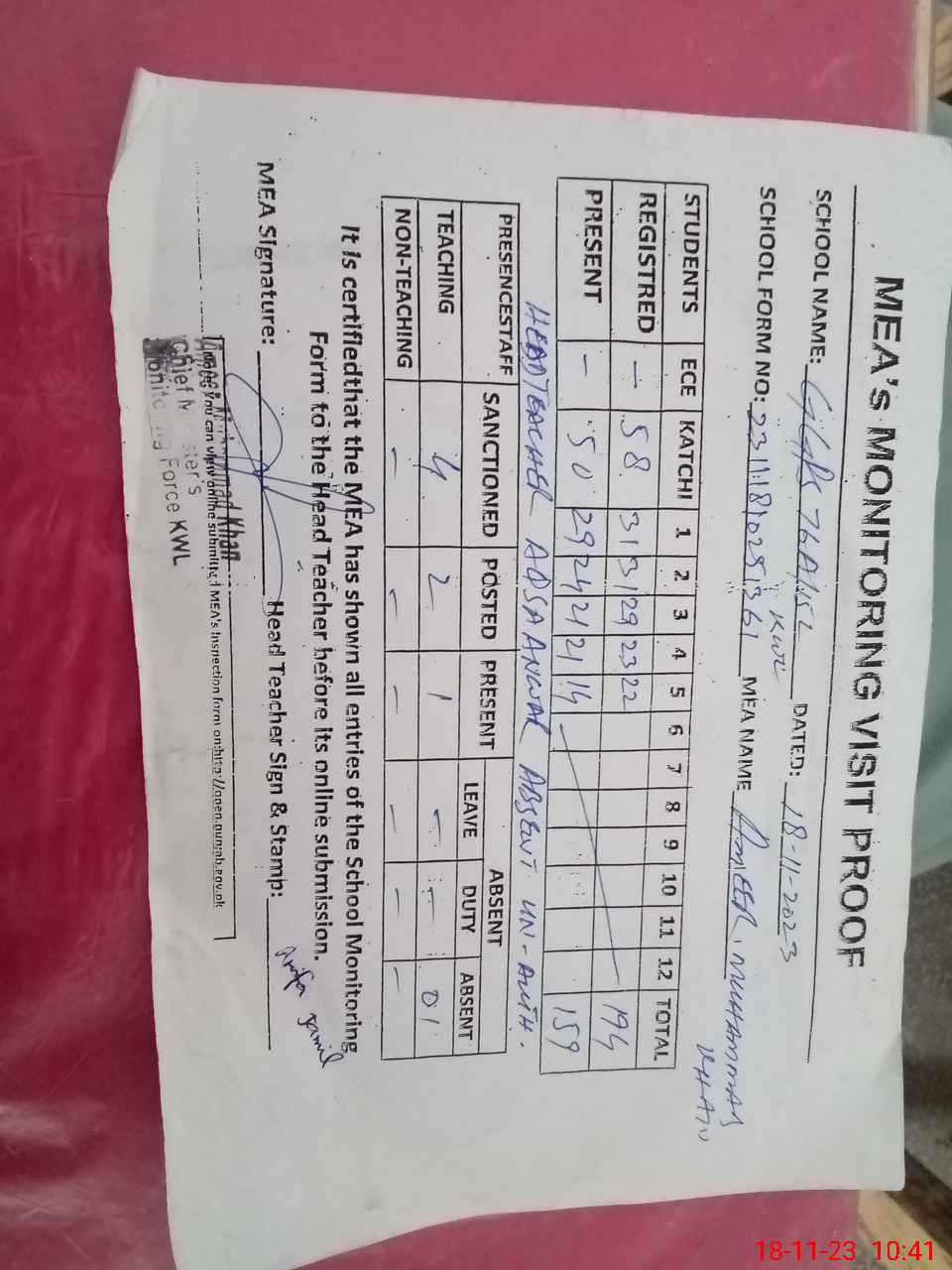 | Attendance Register | Head Teacher | MEA with School | Visit Proof |