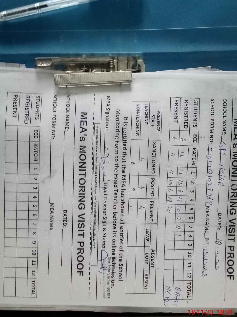 | Attendance Register | Head Teacher | MEA with School | Visit Proof |