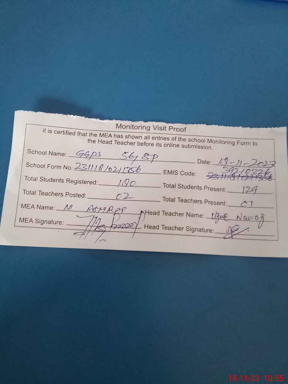 | Attendance Register | Head Teacher | MEA with School | Visit Proof |