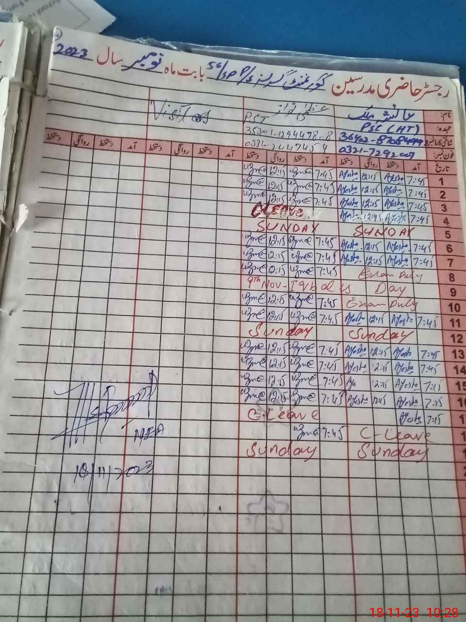 | Name: Uz**** Na**** Designation: (School Headmaster's/Headmistress's) PST Phone/Cell Number: 03**** |