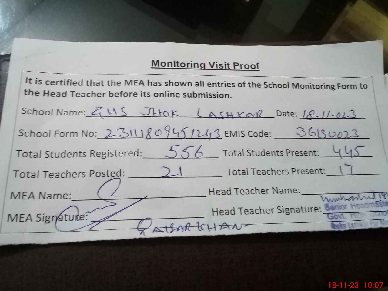 | Attendance Register | Head Teacher | MEA with School | Visit Proof |