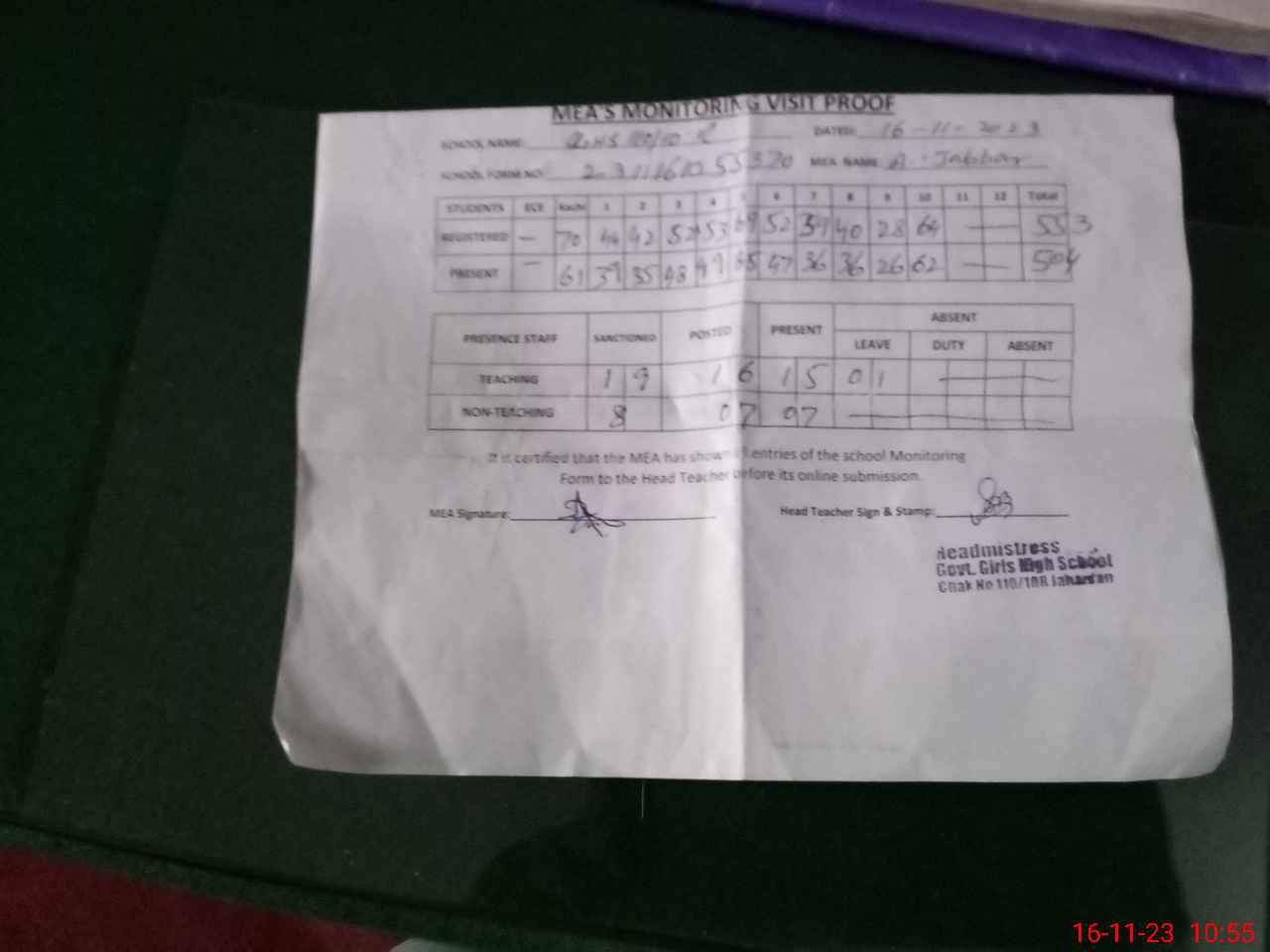 | Attendance Register | Head Teacher | MEA with School | Visit Proof |