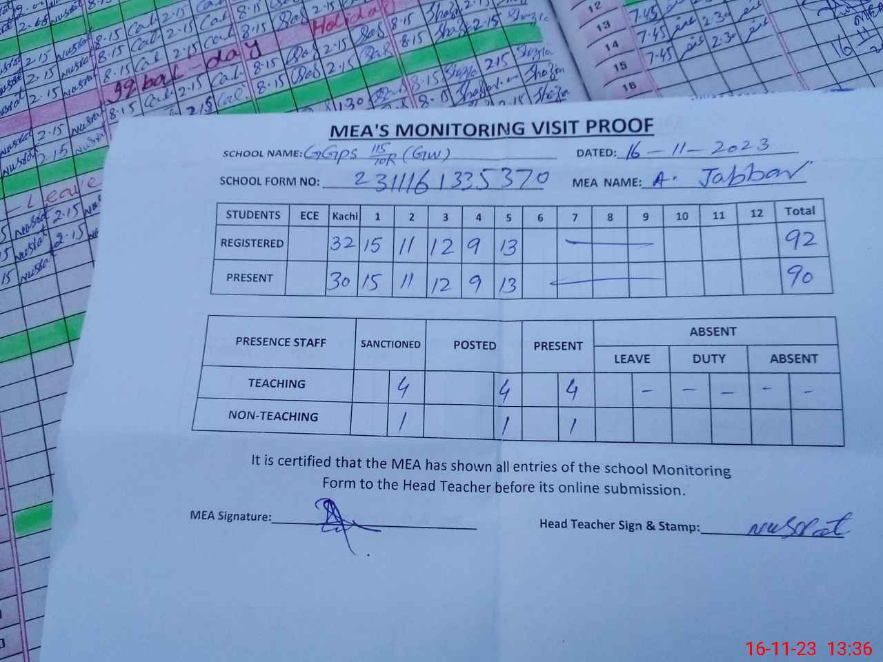| Attendance Register | Head Teacher | MEA with School | Visit Proof |