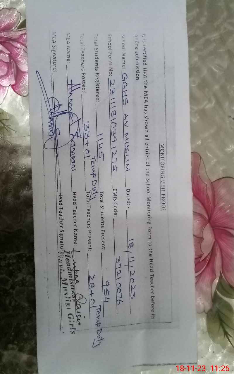 | EMIS Code: 37210076 | Name of School: GGHS AV MUSLIM JHELUM | |||