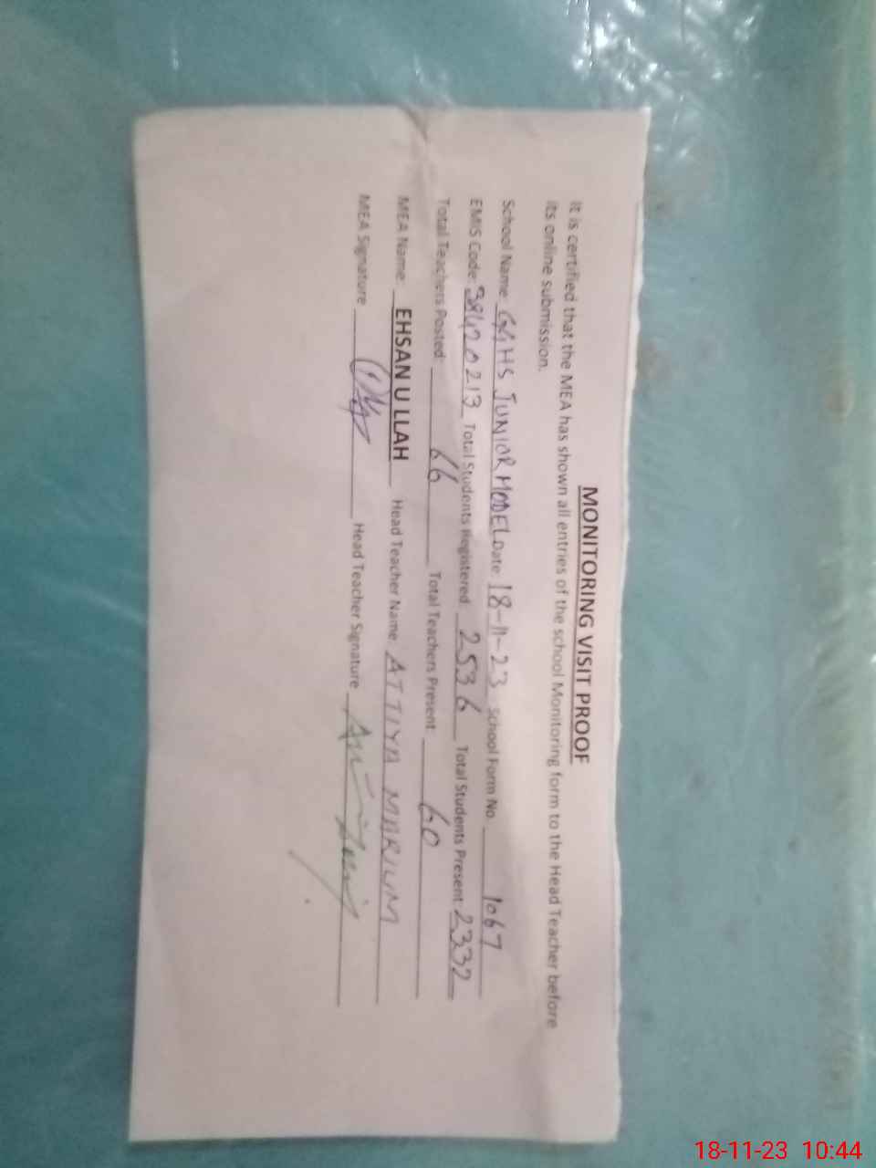 | Attendance Register | Head Teacher | MEA with School | Visit Proof |