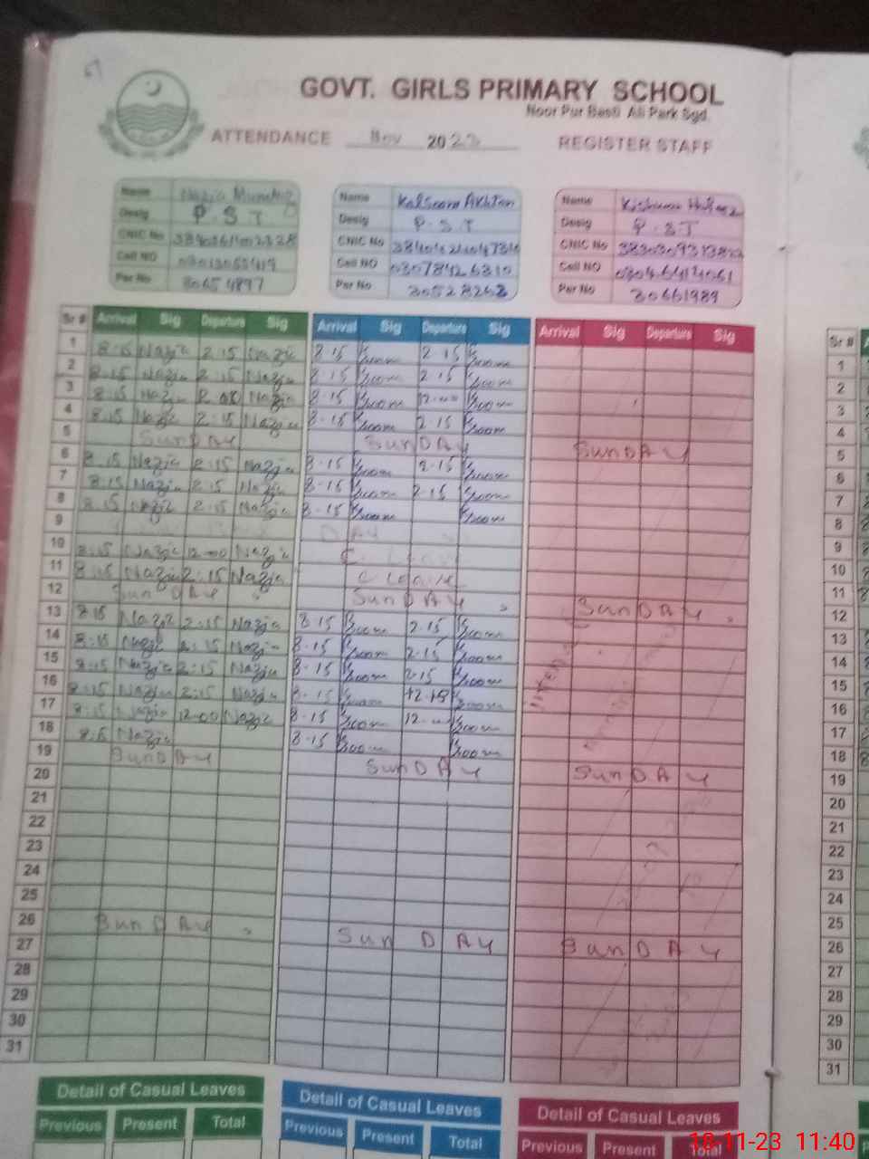 | CNIC | Full Name | Designation | R/C | Absence During Last Calender Month |