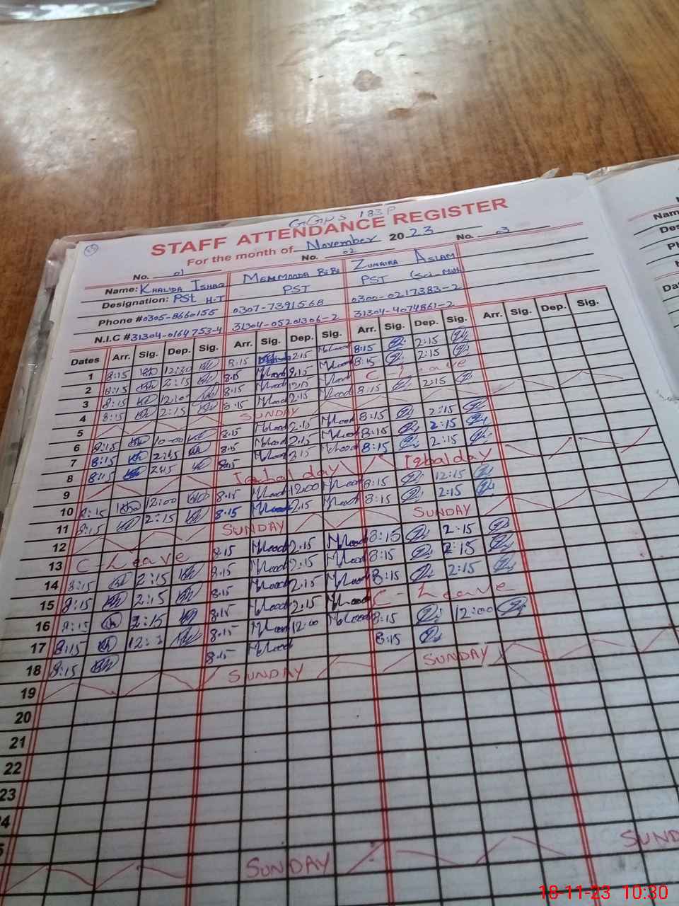 | CNIC | Full Name | Designation | R/C | Absence during last cal. month |