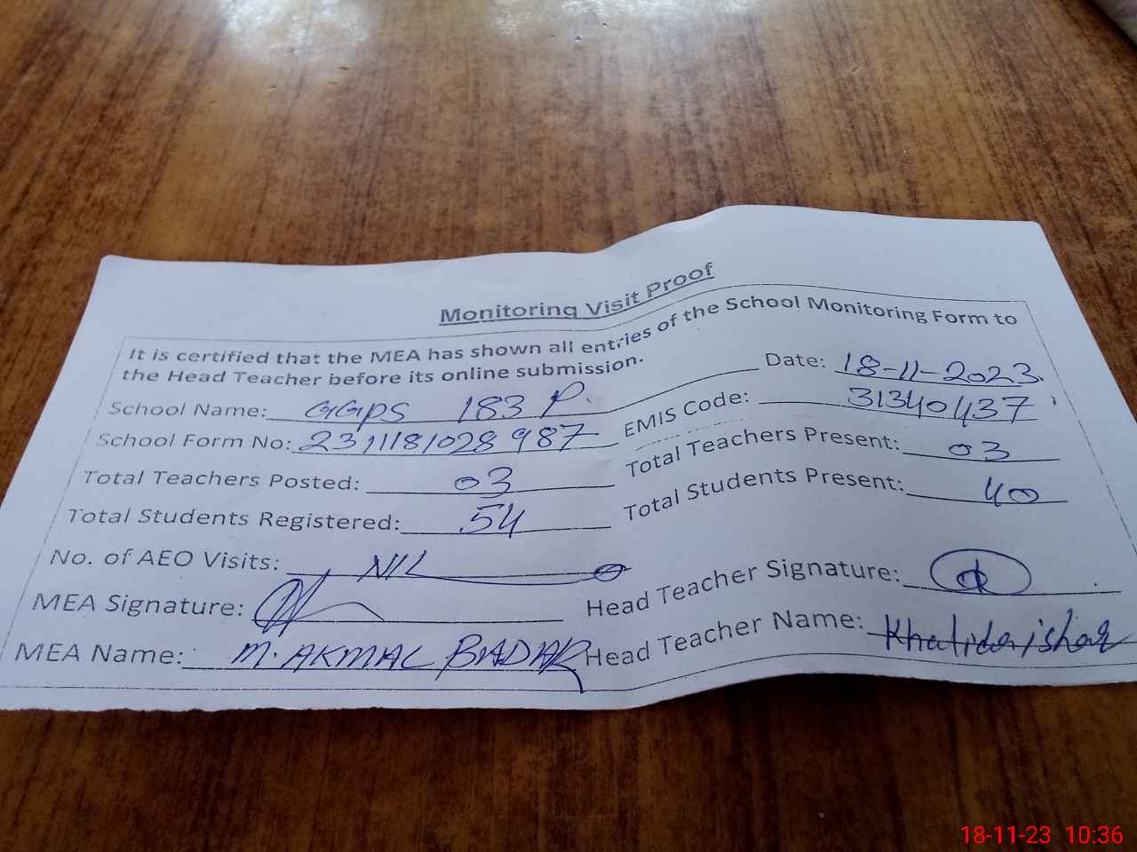 | Attendance Register | Head Teacher | MEA with School | Visit Proof |