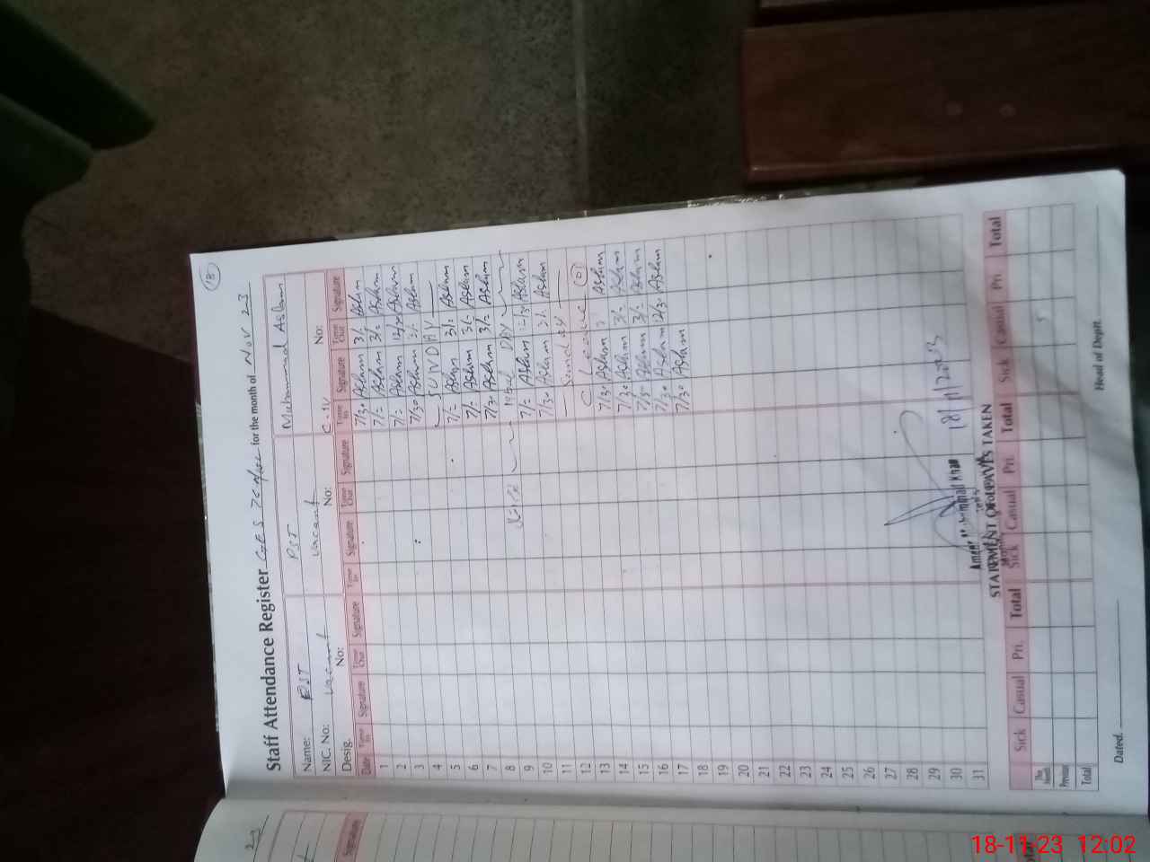 | CNIC | Full Name | Designation | R/C | Absence During Last Calender Month |