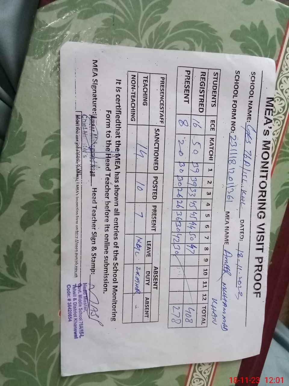 | Attendance Register | Head Teacher | MEA with School | Visit Proof |