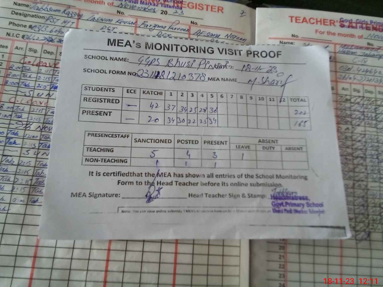 | Attendance Register | Head Teacher | MEA with School | Visit Proof |