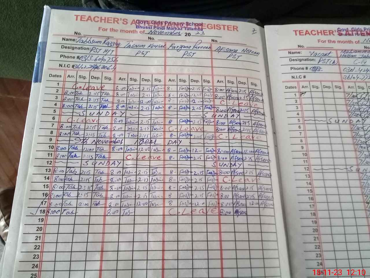 | CNIC | Full Name | Designation | R/C | Absence During Last Calender Month |