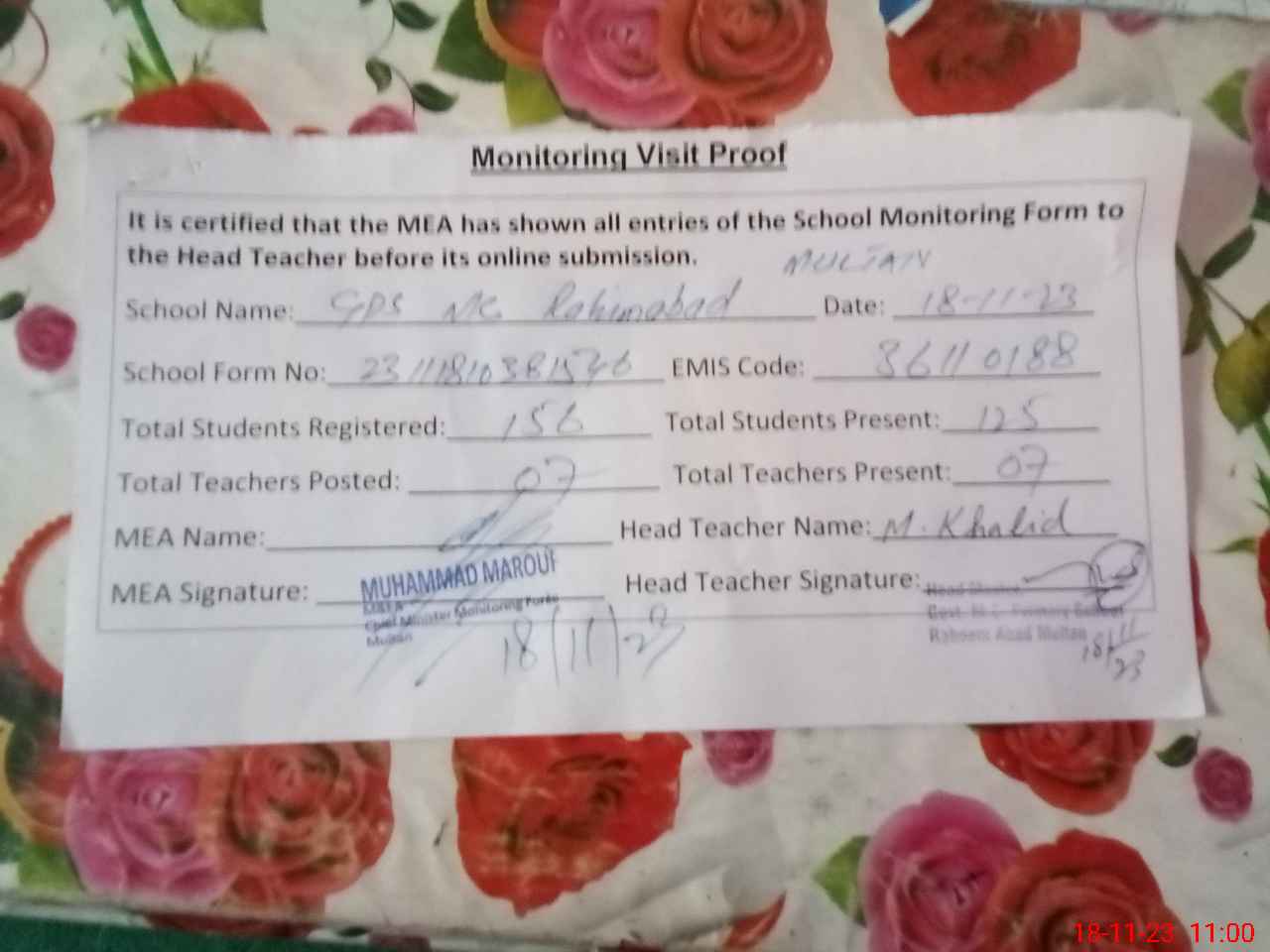| EMIS Code: 36110188 | Name of School: GPS MC RAHIMABAD MULTAN | |||