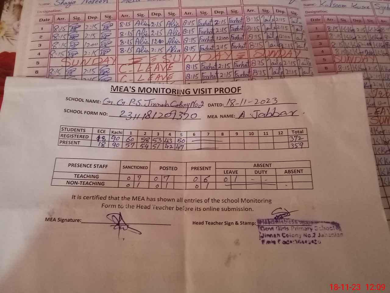 | Attendance Register | Head Teacher | MEA with School | Visit Proof |