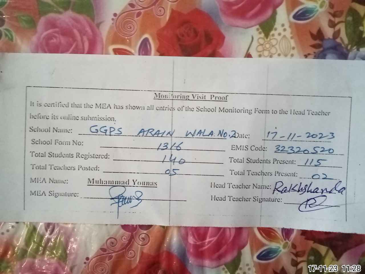 | EMIS Code: 32320520 | Name of School: GGPS ARAIN WALA NO.2 | |||