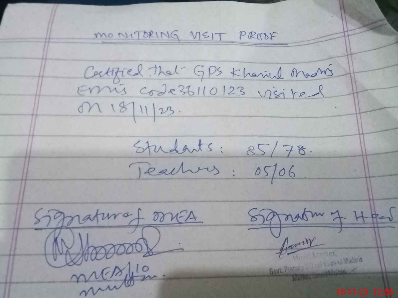 | Attendance Register | Head Teacher | MEA with School | Visit Proof |