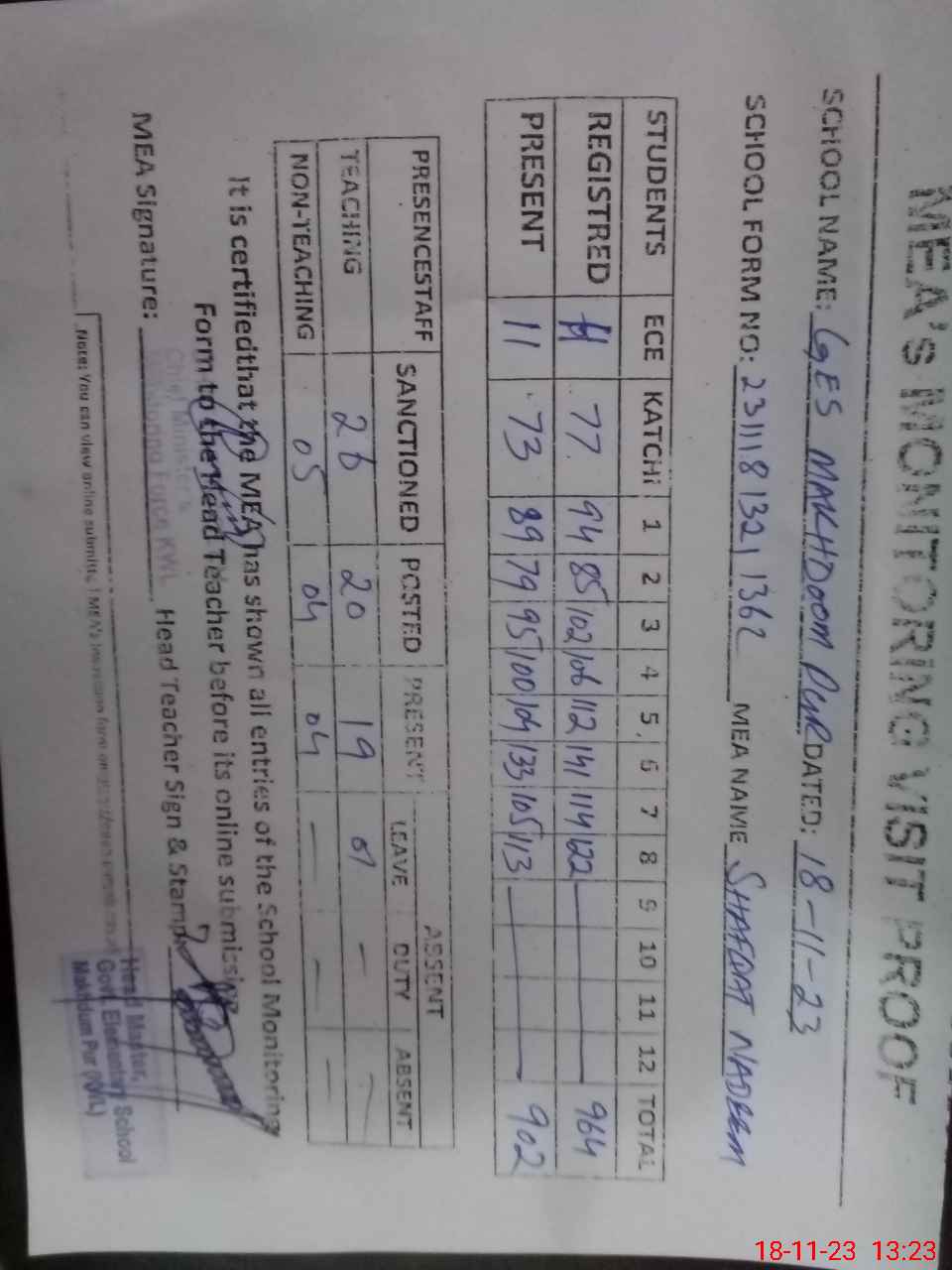 | Attendance Register | Head Teacher | MEA with School | Visit Proof |