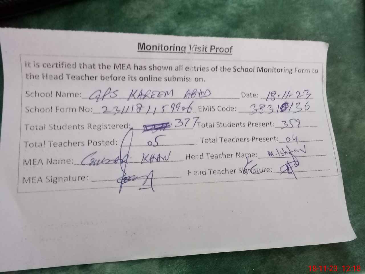 | Total no. of Classrooms: 5 No. of Classrooms Used for Teaching: 5 No. of Classrooms Storing Old Furniture, FTBs, etc: 0Comments if Any: PST Zafar Iqbal absent due to leave not approved on SIS and also attendance Mark as present but physical not present in the school during MEA visit |