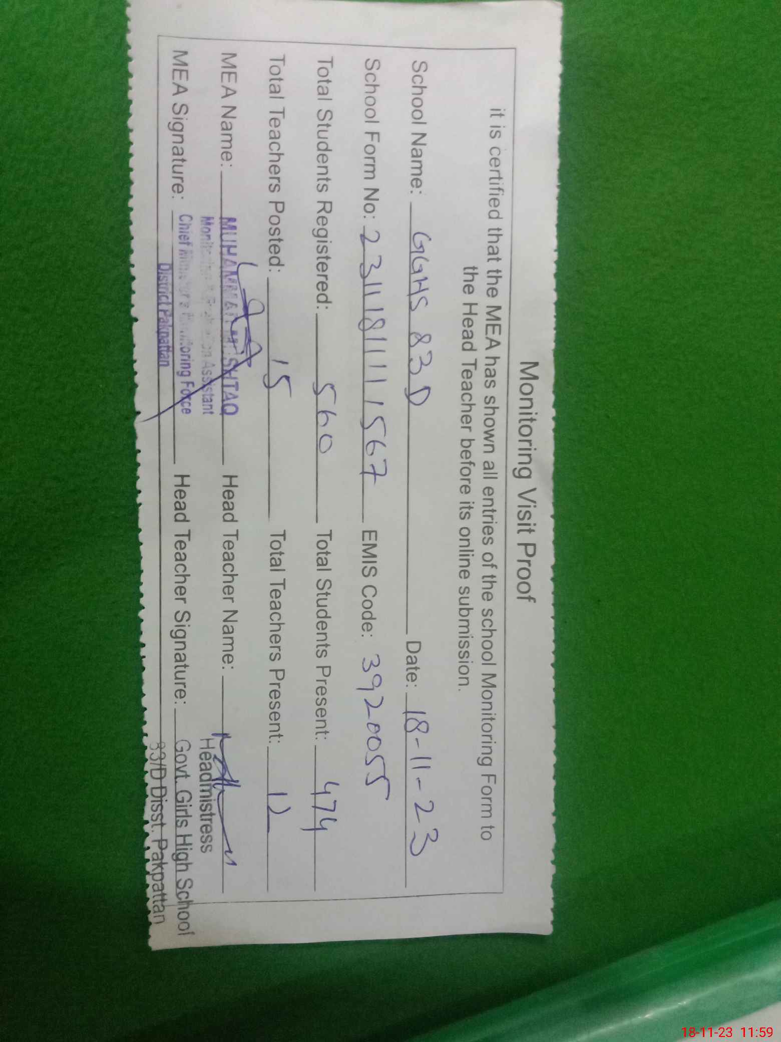 | Attendance Register | Head Teacher | MEA with School | Visit Proof |