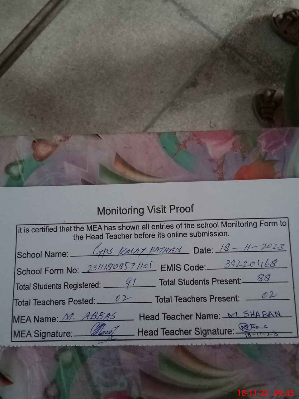 | Attendance Register | Head Teacher | MEA with School | Visit Proof |