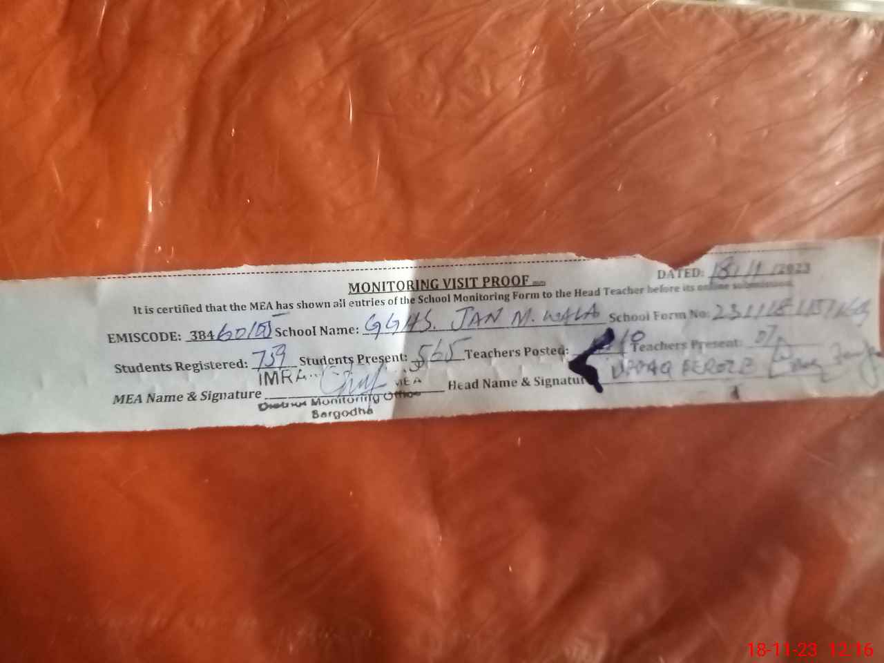 | EMIS Code: 38460105 | Name of School: GGHS JAN MUHAMMAD WALA | |||