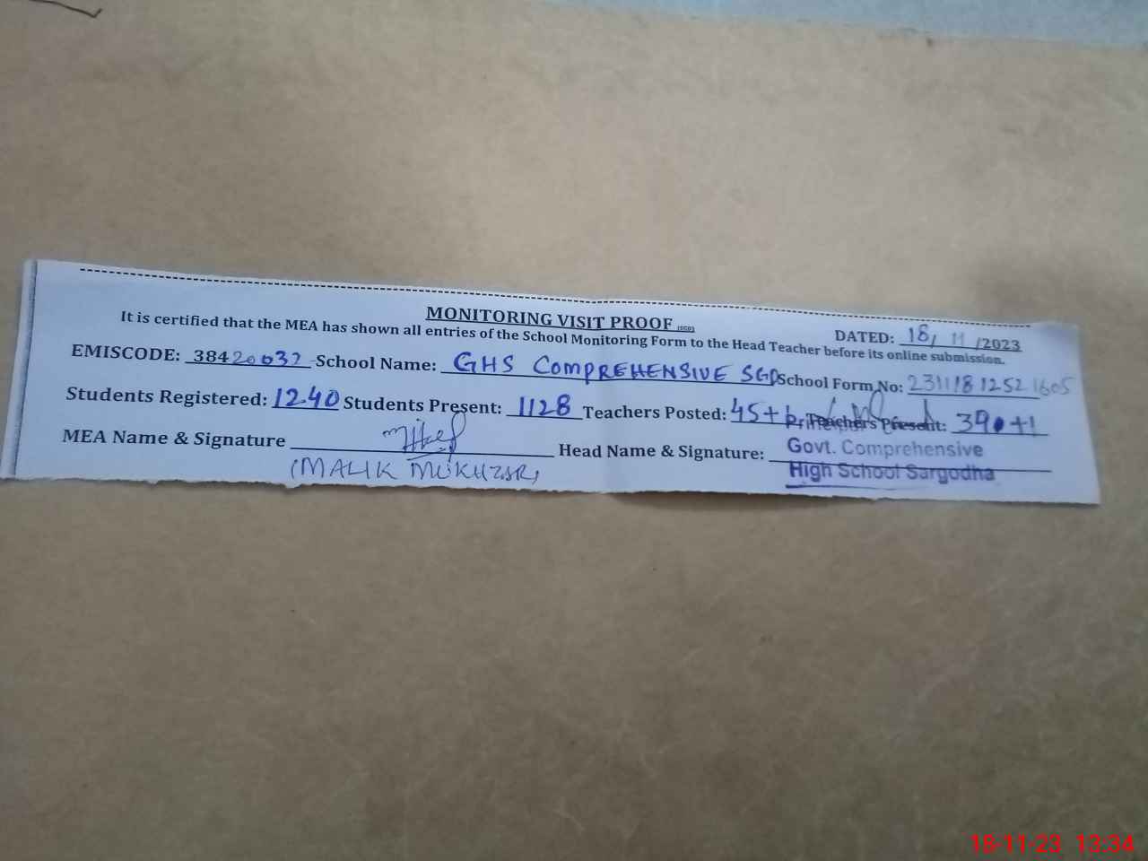 | EMIS Code: 38420032 | Name of School: GHS COMPREHENSIVE SARGODHA | |||