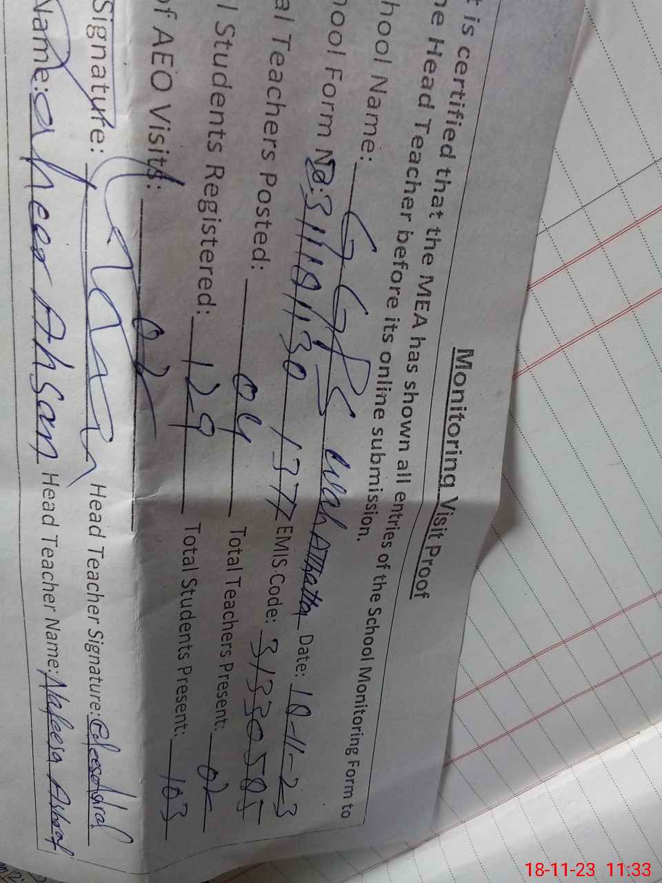 | Attendance Register | Head Teacher | MEA with School | Visit Proof |