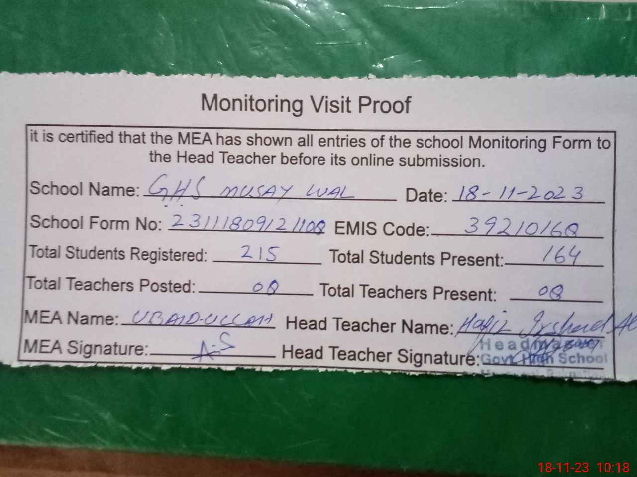 | Attendance Register | Head Teacher | MEA with School | Visit Proof |