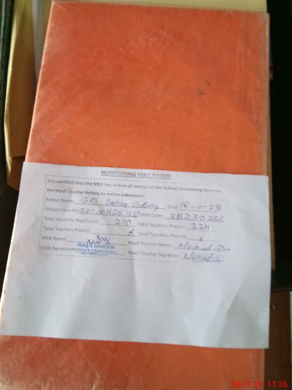 | Attendance Register | Head Teacher | MEA with School | Visit Proof |