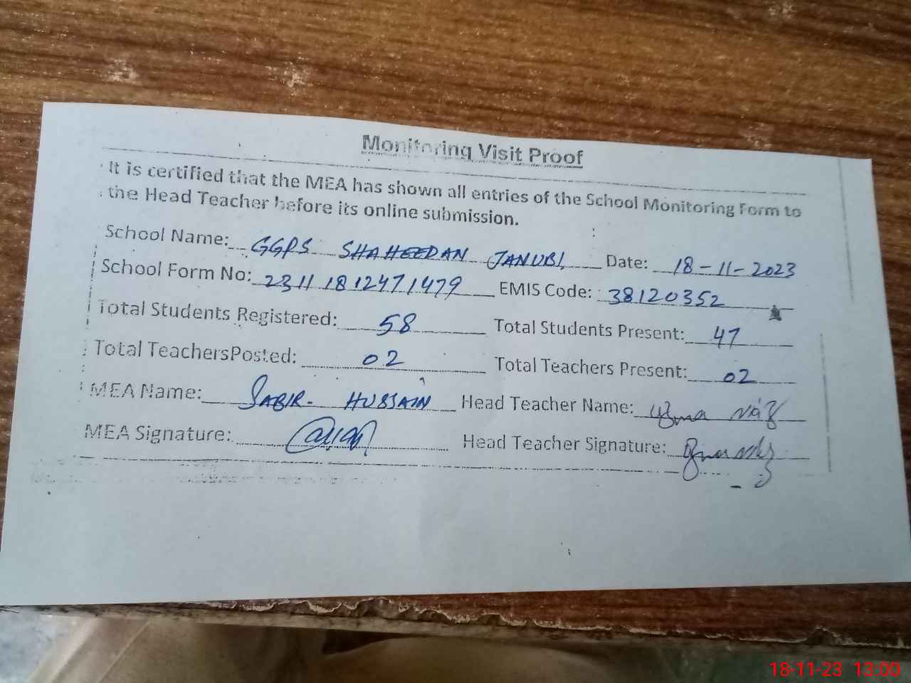 | EMIS Code: 38120352 | Name of School: GGPS SHAHEEDAN JANUBI | |||