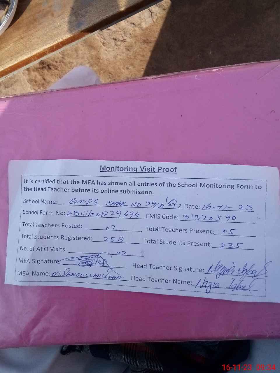 | Attendance Register | Head Teacher | MEA with School | Visit Proof |