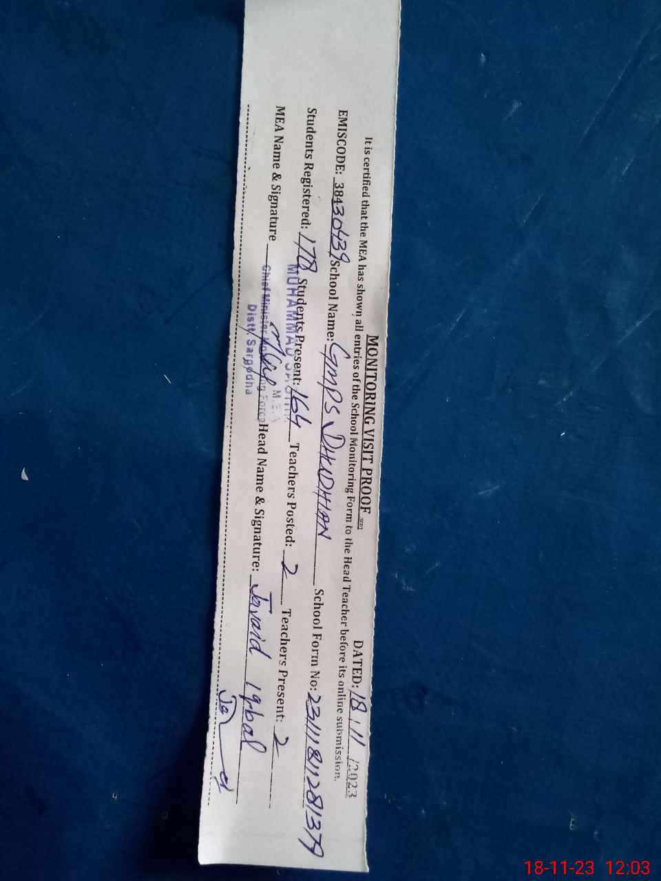 | Attendance Register | Head Teacher | MEA with School | Visit Proof |