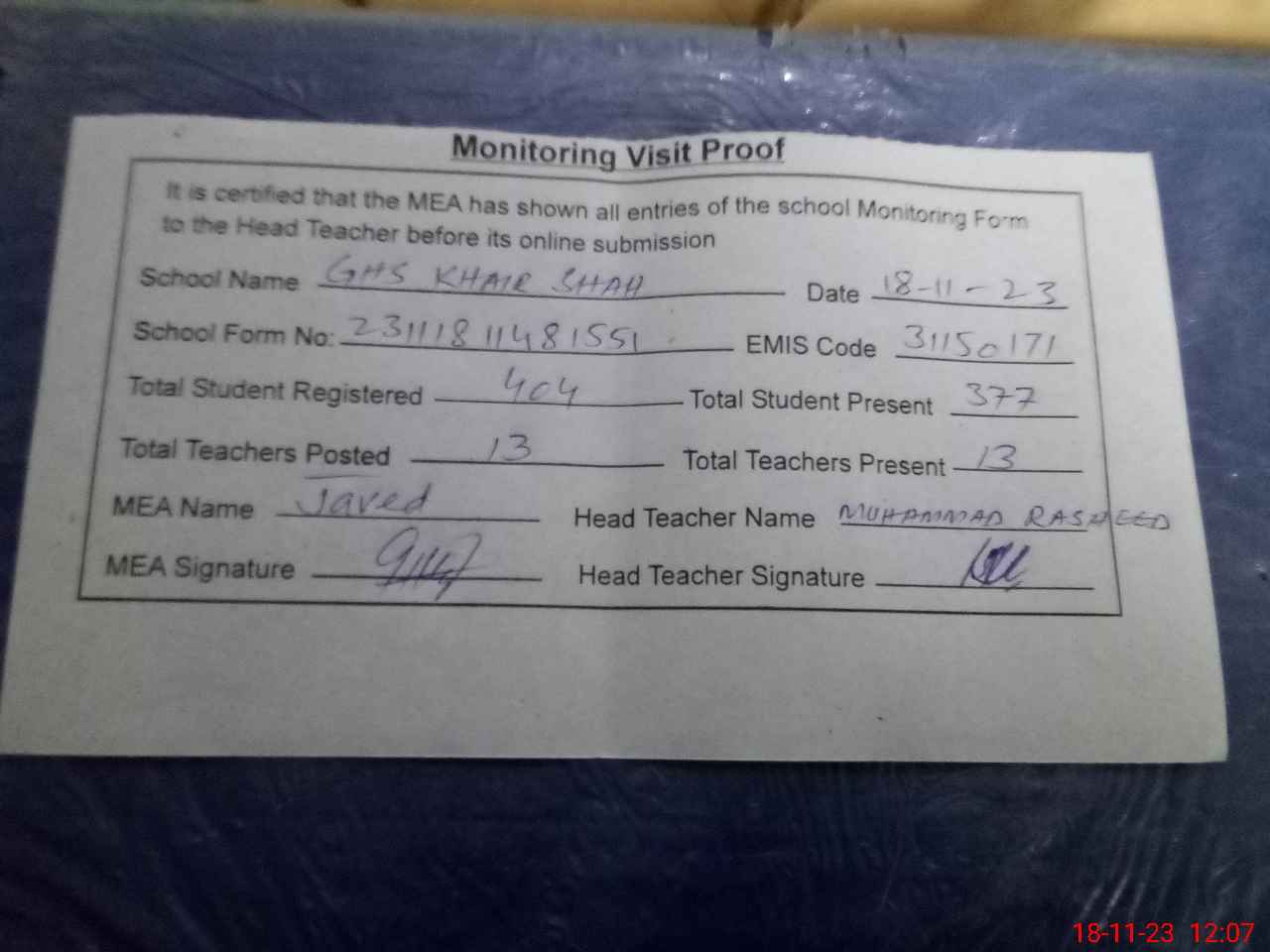 | EMIS Code: 31150171 | Name of School: GHS KHAIR SHAH OTTAR | |||