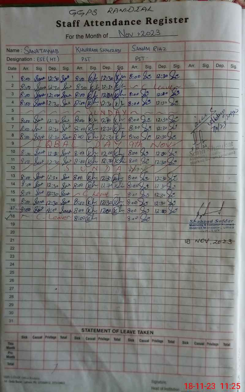 | Total no. of Classrooms: 3 No. of Classrooms Used for Teaching: 3 No. of Classrooms Storing Old Furniture, FTBs, etc: 0Comments if Any: NSB and FTF record registers are in cupboard under lock and keys are with the Head mistress Sana Tayyab ESE who is on leave today as narrated by Khurram Shahzadi PST second in school |