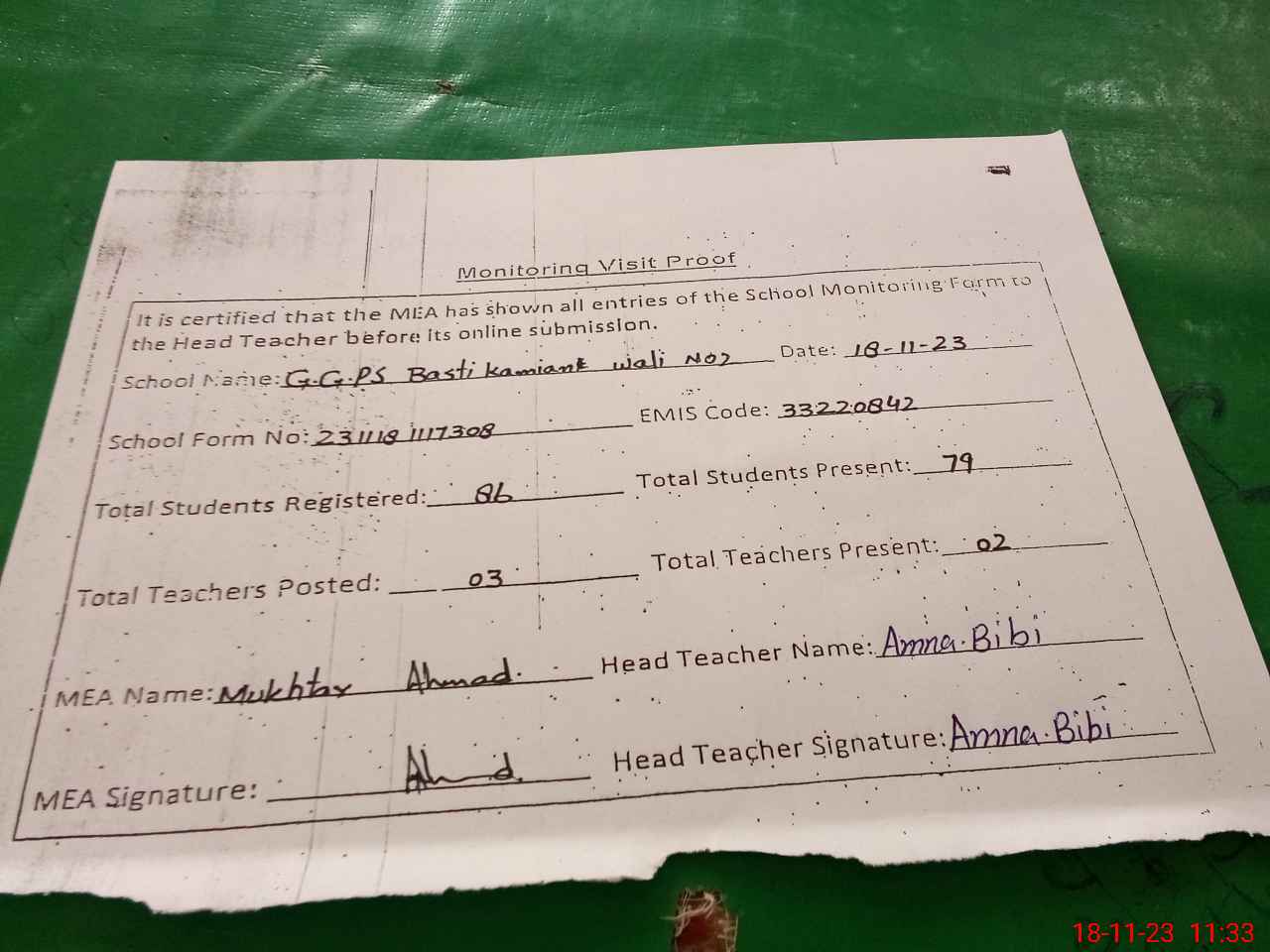 | Attendance Register | Head Teacher | MEA with School | Visit Proof |