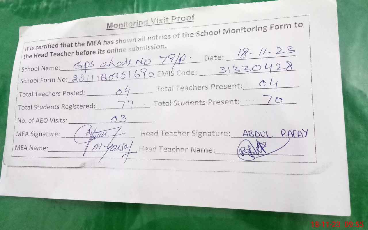 | Attendance Register | Head Teacher | MEA with School | Visit Proof |
