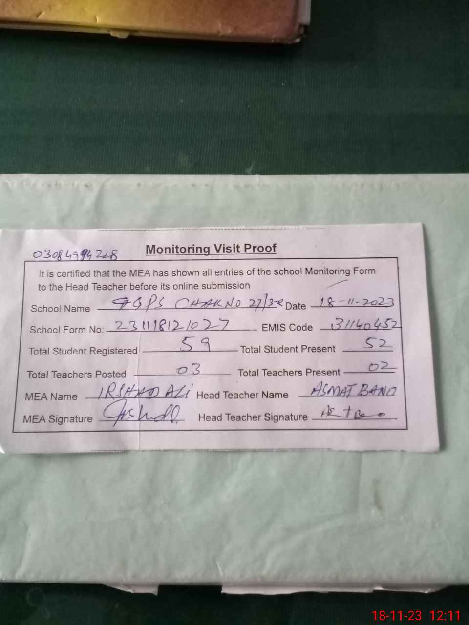 | EMIS Code: 31140452 | Name of School: GGPS CHAK NO. 27/3-R | |||