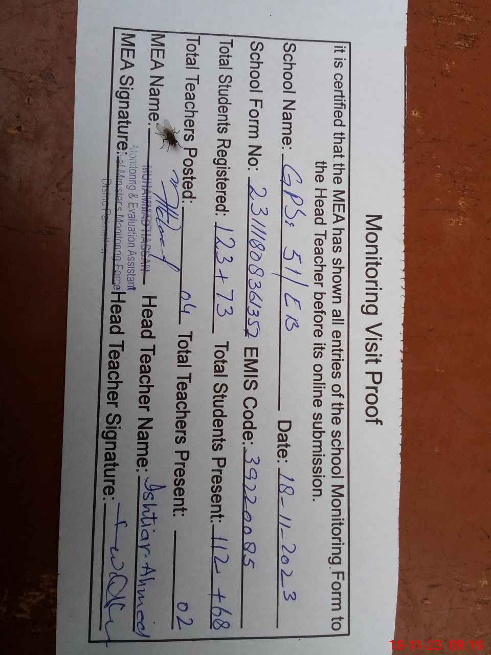 | Attendance Register | Head Teacher | MEA with School | Visit Proof |