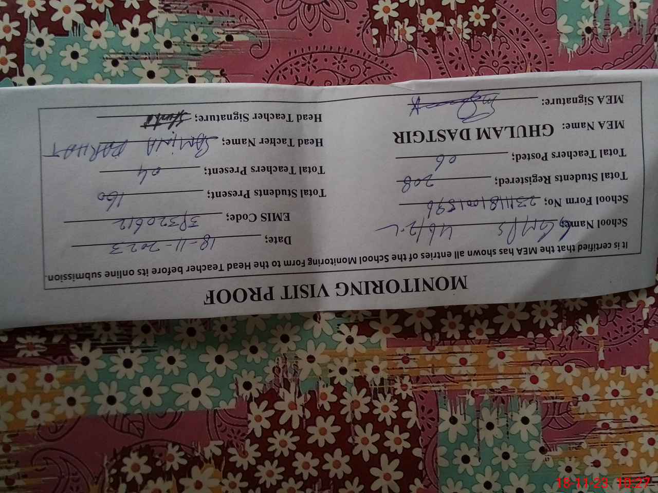 | Attendance Register | Head Teacher | MEA with School | Visit Proof |