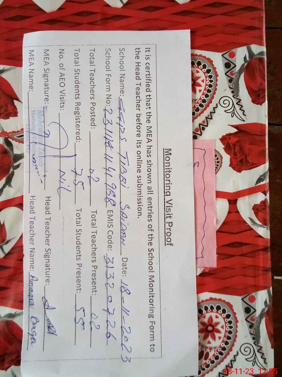 | Attendance Register | Head Teacher | MEA with School | Visit Proof |