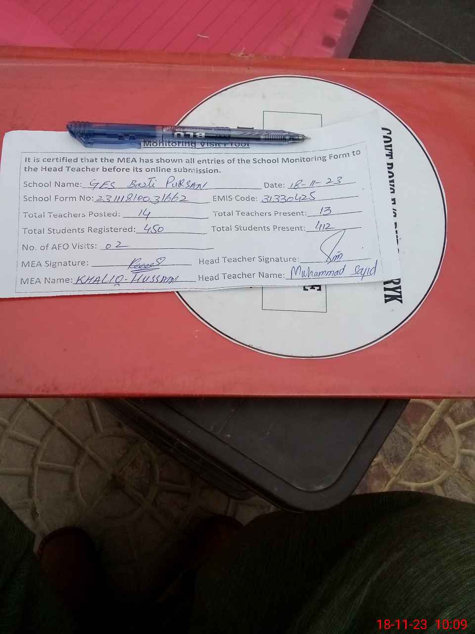 | Attendance Register | Head Teacher | MEA with School | Visit Proof |