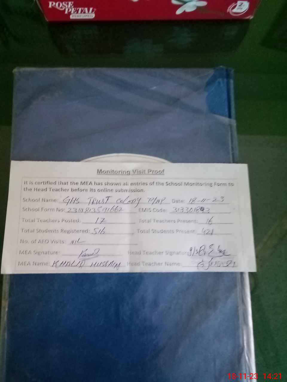 | Attendance Register | Head Teacher | MEA with School | Visit Proof |