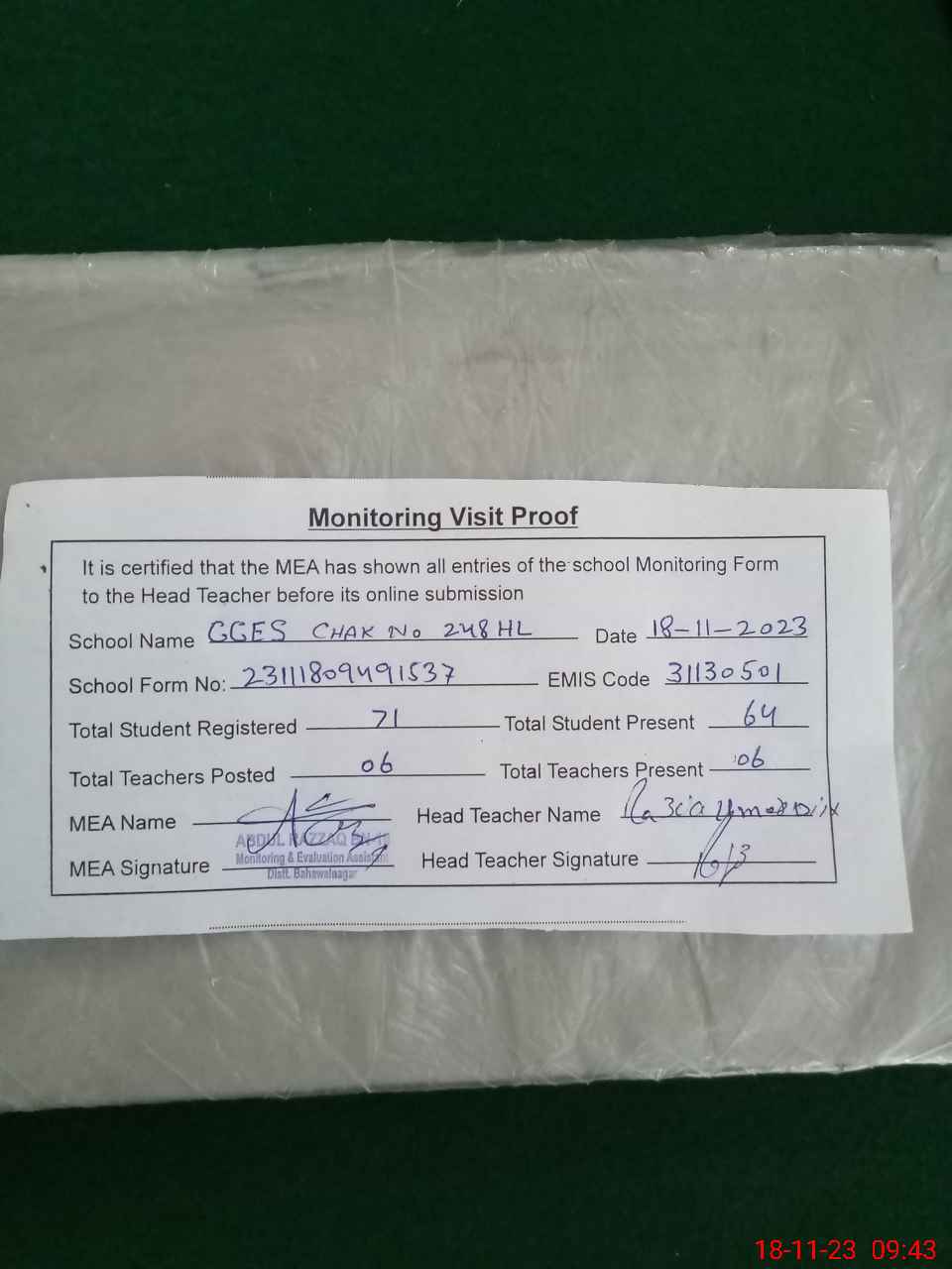 | Attendance Register | Head Teacher | MEA with School | Visit Proof |