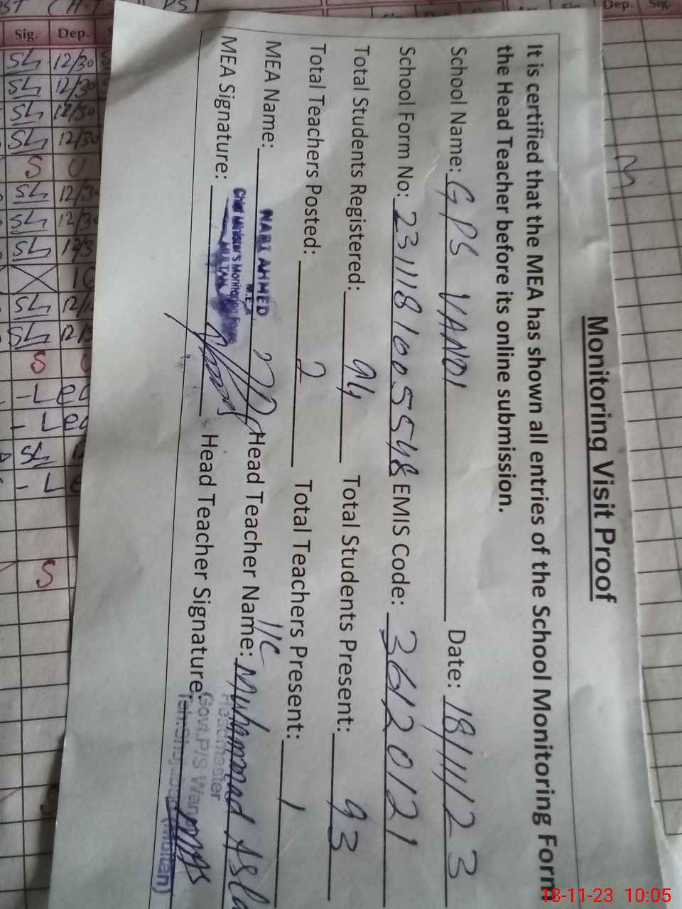 | Attendance Register | Head Teacher | MEA with School | Visit Proof |