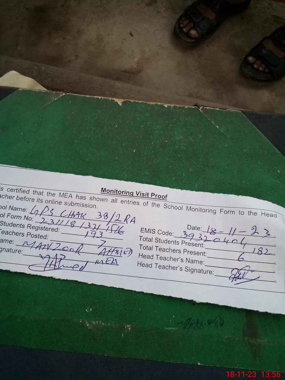 | Attendance Register | Head Teacher | MEA with School | Visit Proof |