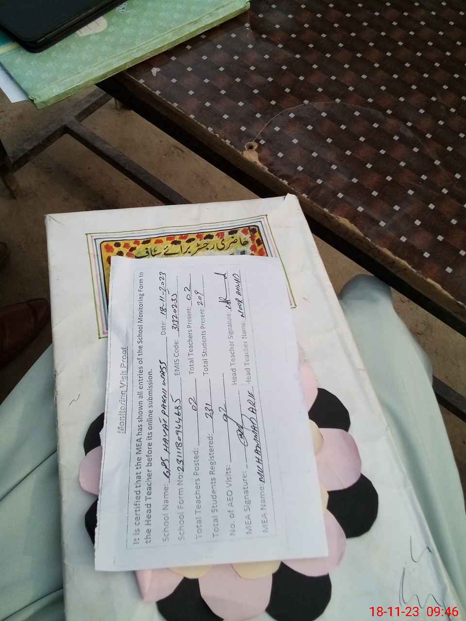 | Attendance Register | Head Teacher | MEA with School | Visit Proof |